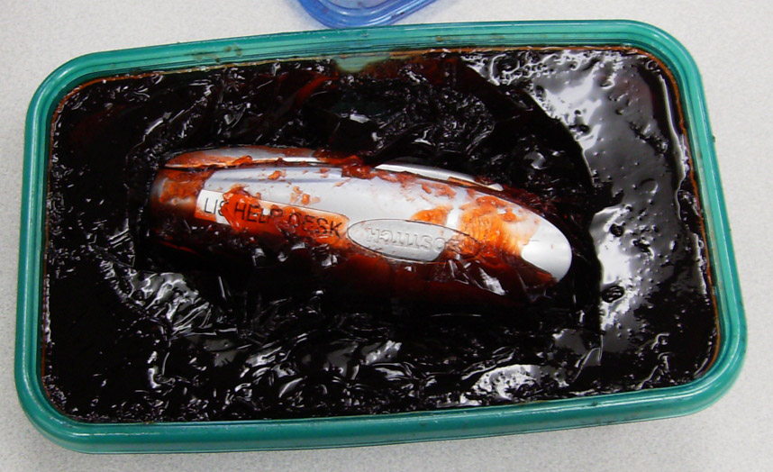 This gift was left for us on one of our desks at work today. In case you can’t tell, that’s a stapler. In Jell-O.