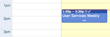 This is my calendar at work today. Listed at 1:30 is the User Services meeting of which I am part as the Lead of the Help Desk. We have these every few weeks so we can get together. Today brought good news. The meeting was canceled!