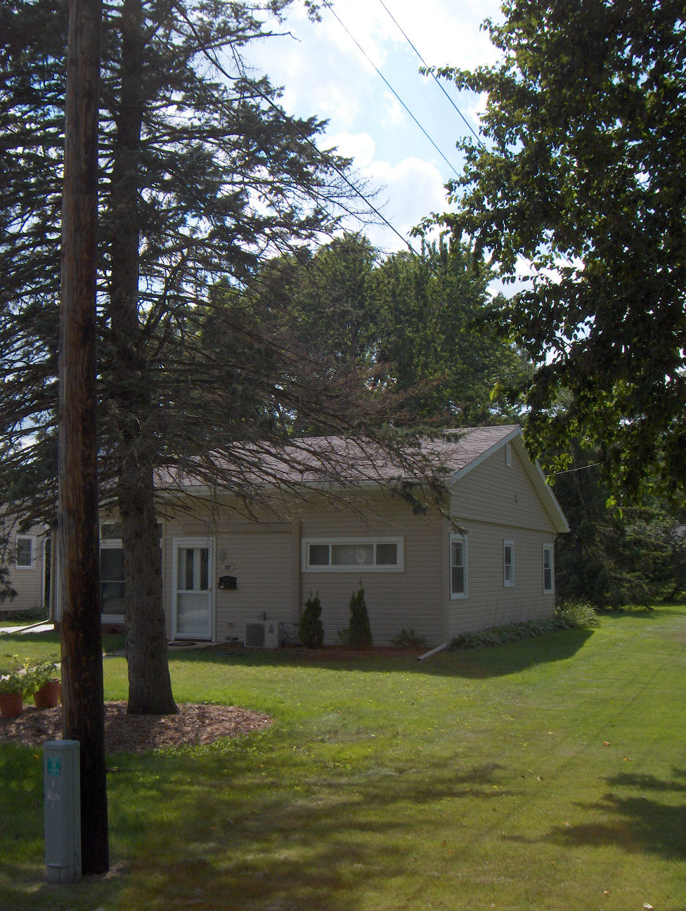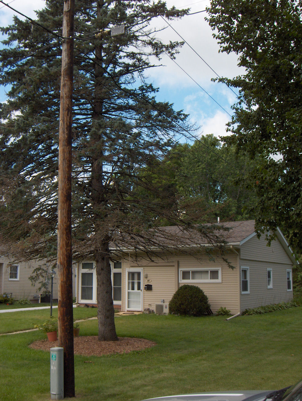 Sad as it is, it does pose a problem for us. See that tall telephone post? At the top of it is a street light. Only one on our block. And it shines right into our bedroom window. Losing the Blue Spruce means we’re going to have very bright nights.