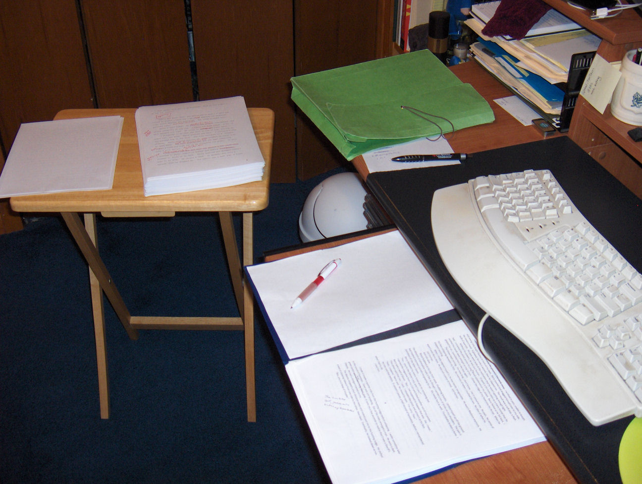 On the left is the completed draft of Genie Memories, double-spaced and Courier font-size 12. 334 pages. Perfect for making notes. On the right, the single spaced draft I used while actually writing the story. Scattered throughout its pages are notes I made but didn’t want to go back and make the changes at the time. Eventually I’ll consolidate it down to just one stack of papers.