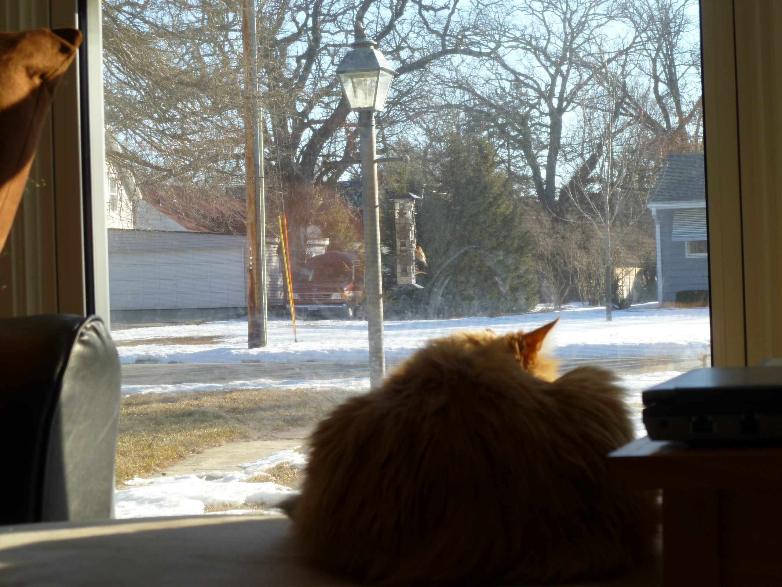 A little while back, we got a new bird feeder. Here’s Tim Tam enjoying it from our new couch: