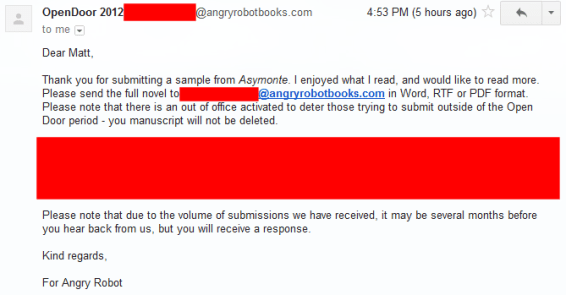 In layman’s terms – this is very awesome. To the Nth degree. It may be months down the road but a request for a full is the highest I’ve ever gotten in the publishing world.
