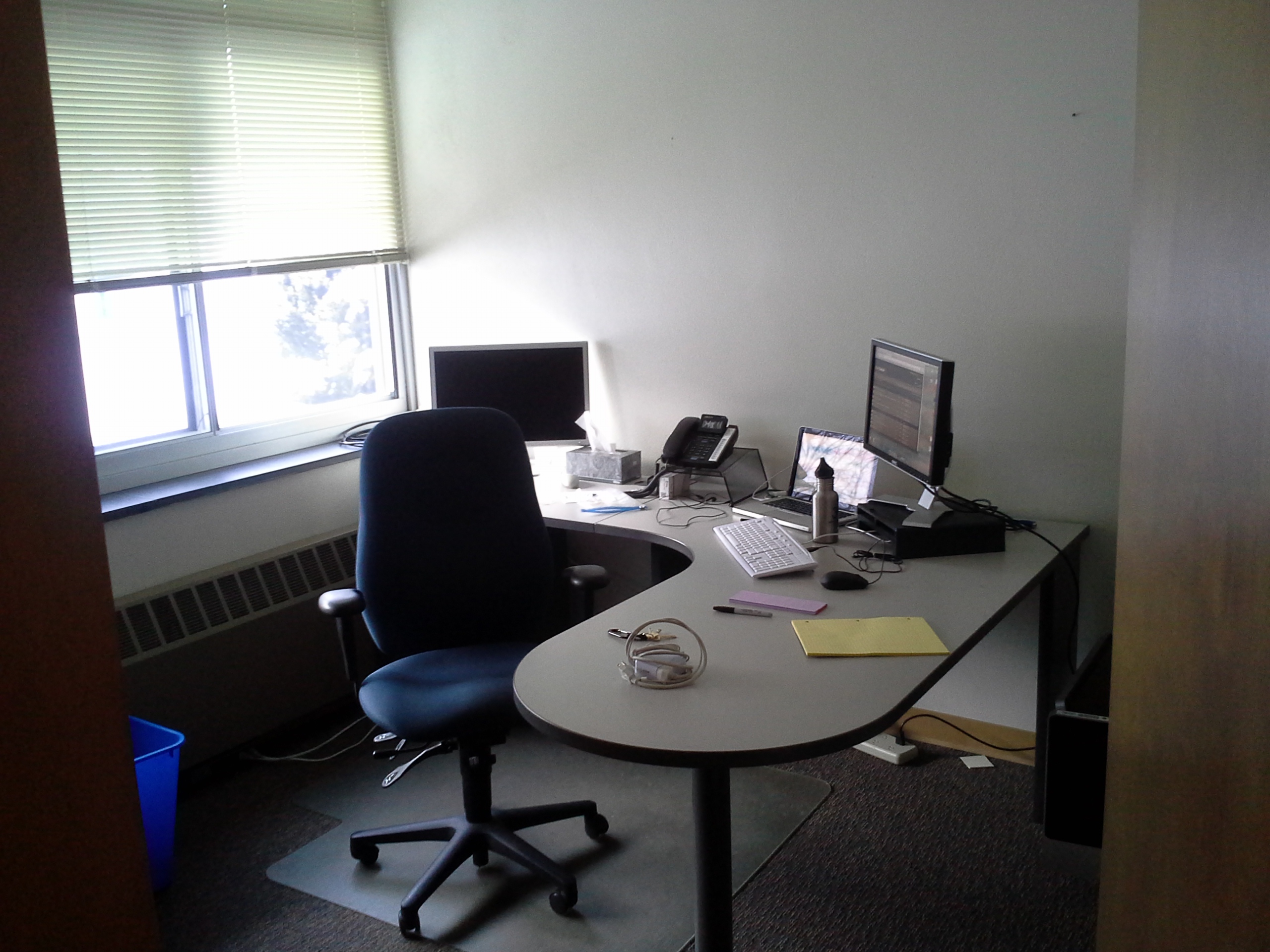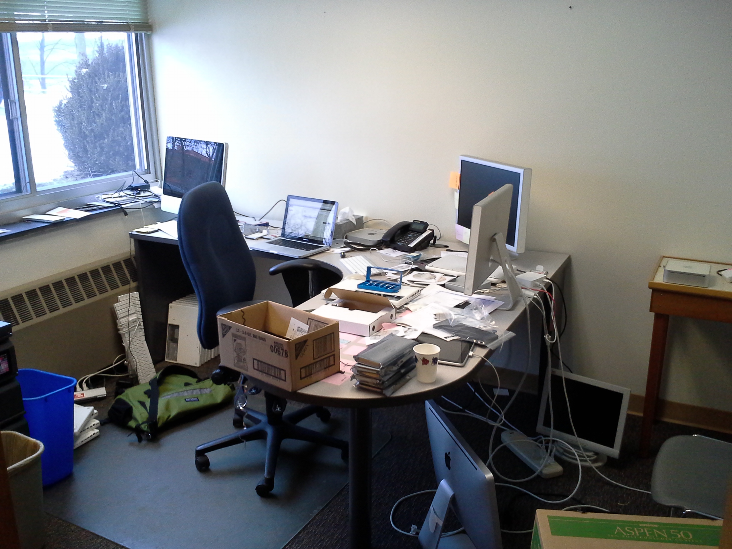 A bit of a mess, one might say. Unseen are the cabinets to the left which were equally disastrous. In cleaning up, we uncovered 29 Macbooks in various states of repair (one of my jobs is to go through and find out exactly what state they are in), four iMacs, cables, adapters, and over 100 Windows 95 CDs among other things. Why, I have no idea. When I finally managed to clear the desk, I found a second layer underneath including dozens of Post-It notes with important information written on them. That all went into a folder which I then had to put into a couple of spreadsheets.