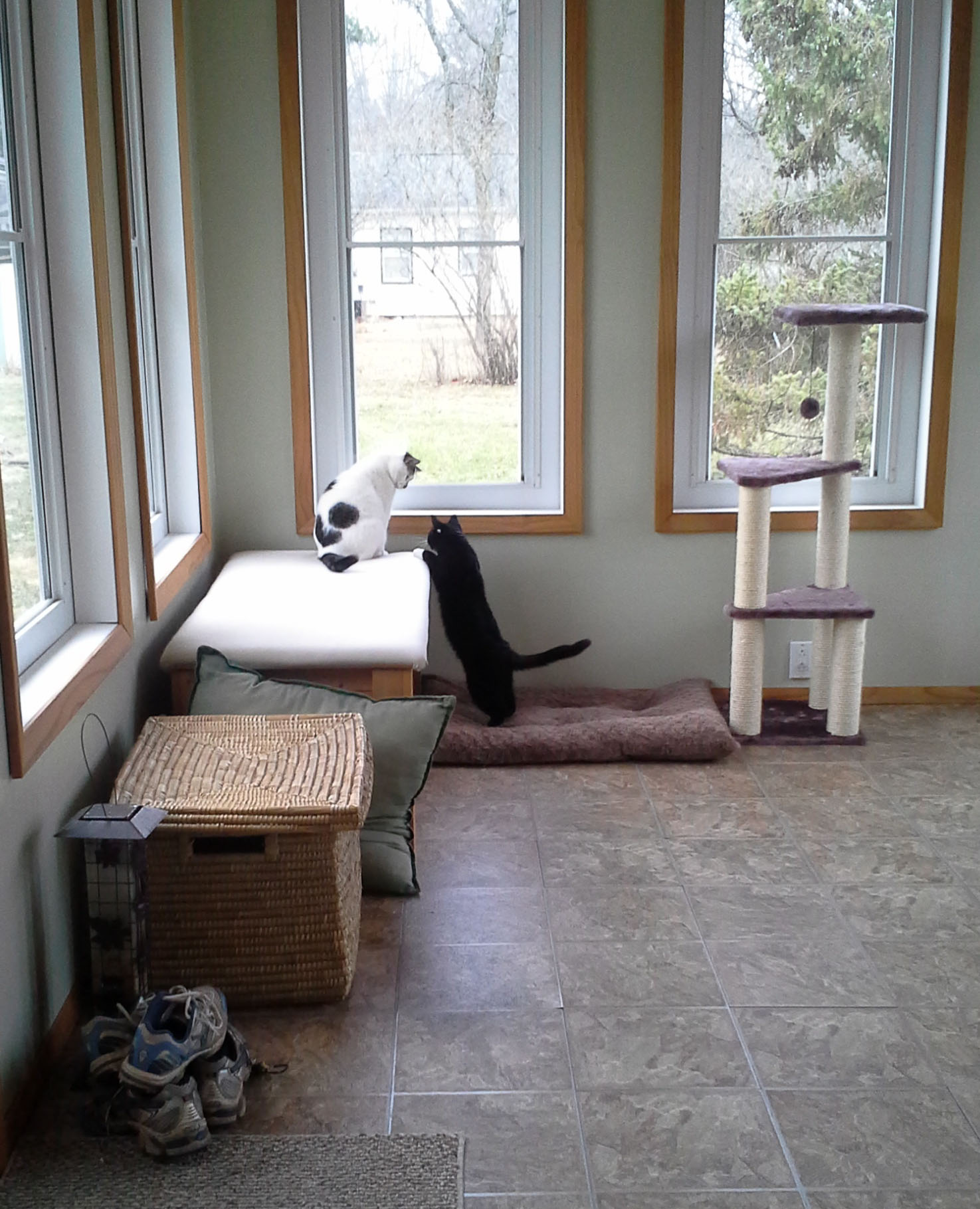 I would like to say that they sat next to each other and basked in the sun. But that’s not what happened. What happened was Skye bopping Cici on the forehead and knocking her off the bench, then flopping town to take a nap after successfully defending her domain.