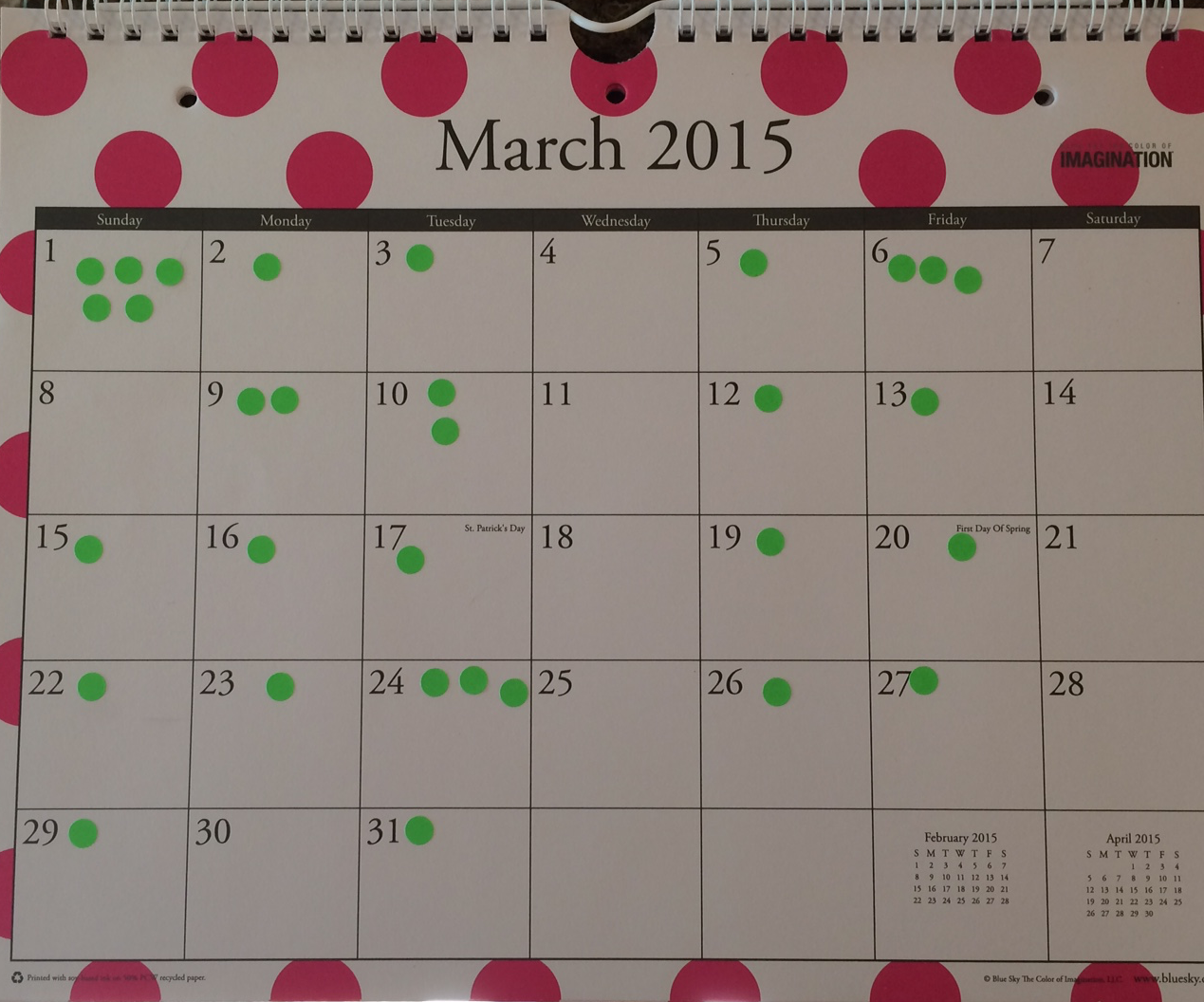 Not nearly as good but better than I expected. A mere 5,500 words for the month. You’ll also note that I switched to Pink dots … that’s cuz I ran out of Green. A few things to note:
